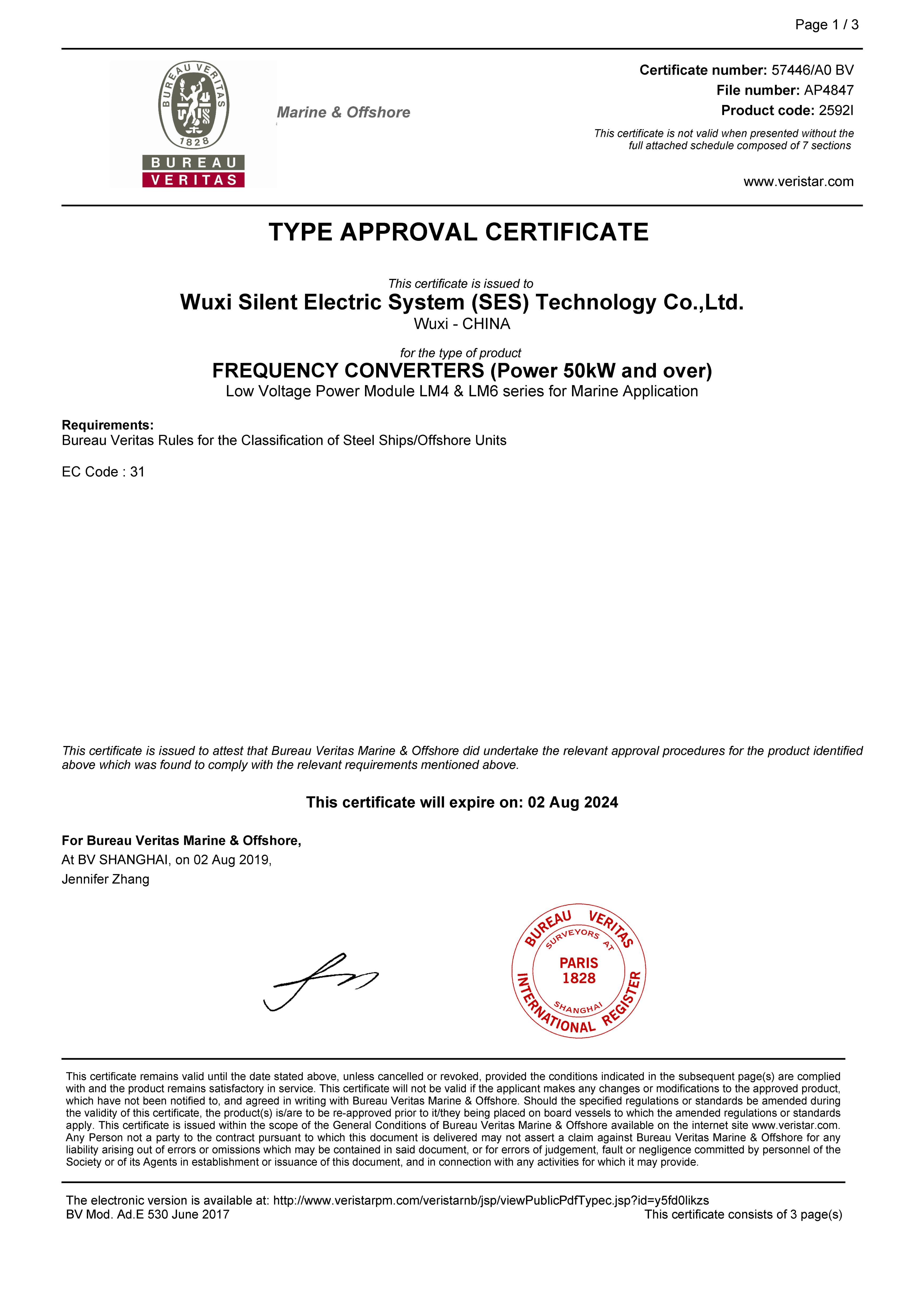 公司獲法國船級社船用變頻器型式認(rèn)可證書