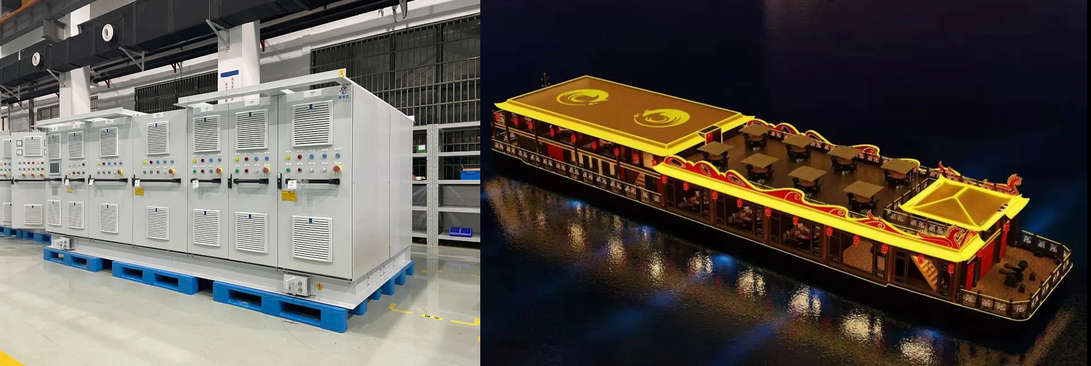 “大唐1號(hào)”游船由廣元市武則天文化旅游產(chǎn)業(yè)發(fā)展有限公司打造,由中國船舶集團(tuán)有限公司第七一九研究所總體設(shè)計(jì)并集成供貨,賽思億國產(chǎn)變頻電控設(shè)備成為其關(guān)鍵設(shè)備供應(yīng)商,為該系統(tǒng)提供共直流母線裝置。該船總長50.8m,型寬10.8m,型深2.8m,載客300人,整船鋰電池容量共計(jì)1397.76kWh,是目前西南地區(qū)電池容量最大、船舶尺度最大的純電動(dòng)客船。該船動(dòng)力系統(tǒng)經(jīng)過賽思億自主知識(shí)產(chǎn)權(quán)的直流母線變頻電控設(shè)備在直流母線進(jìn)行并網(wǎng),驅(qū)動(dòng)2臺(tái)225kW的全回轉(zhuǎn)舵槳,同時(shí)可為船舶日用負(fù)載提供高品質(zhì)的日用交流電源。