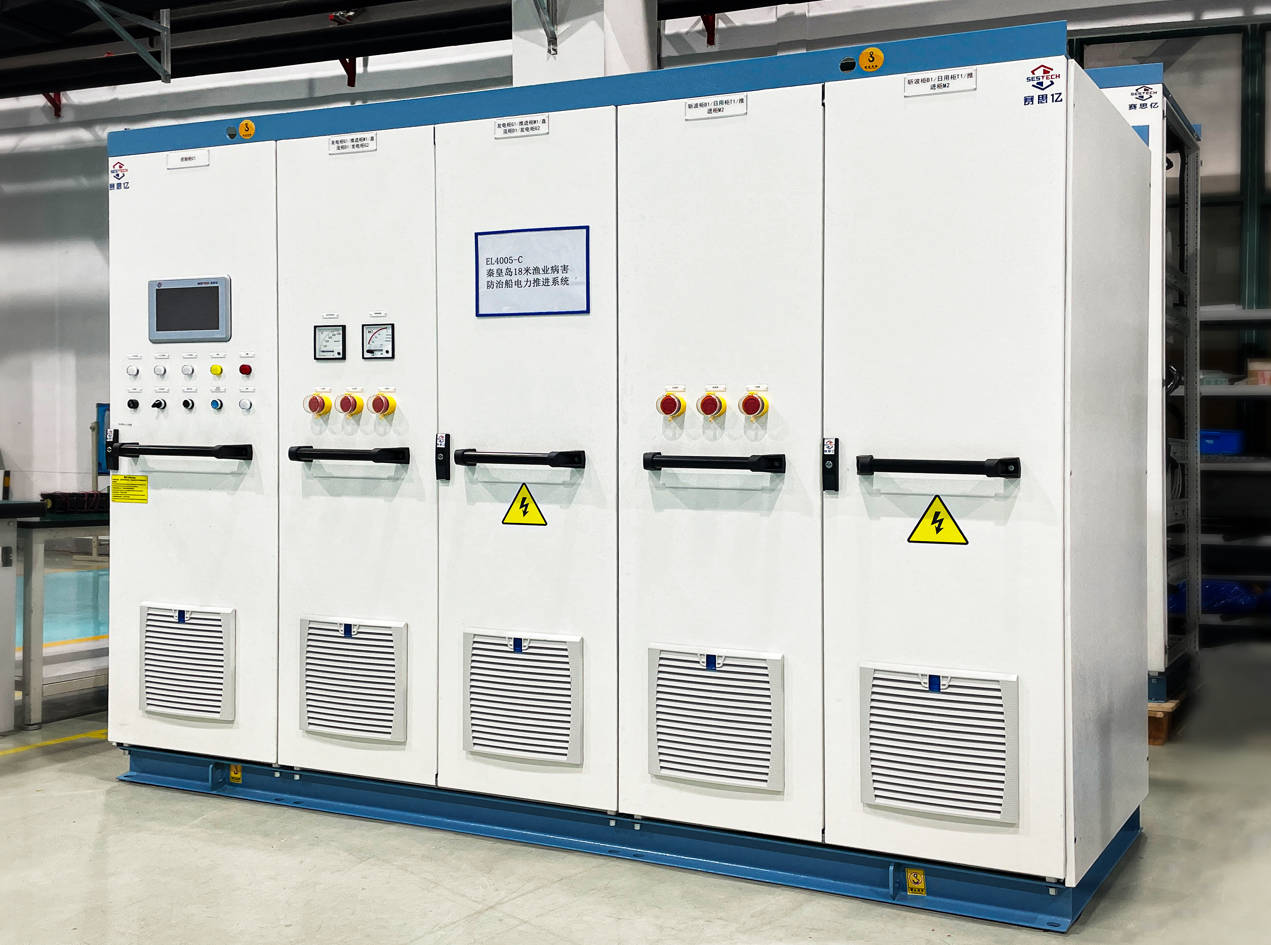 該6艘系列船舶由漁業(yè)機(jī)械儀器研究所設(shè)計、蘇州飛馳環(huán)??萍脊煞萦邢薰窘ㄔ?,總長19.60m,設(shè)計水線長18.50m,型寬4.60m,型深1.80m,設(shè)計吃水1.20m,系統(tǒng)配置2臺90kW的發(fā)電機(jī)組,1套322.56kWh鋰電池組,是新一代節(jié)能環(huán)保船型,主要用于秦皇島北戴河及附近海域赤潮治理工作。其中,變頻控制柜、鋰電池組、主推進(jìn)電機(jī)、推進(jìn)遙控系統(tǒng)、交流配電板、主變壓器等動力系統(tǒng)設(shè)備均由賽思億集成供貨,而動力系統(tǒng)關(guān)鍵裝備——變頻控制柜、推進(jìn)遙控系統(tǒng)均由賽思億負(fù)責(zé)設(shè)計生產(chǎn)和制造,擁有完全自主知識產(chǎn)權(quán)。