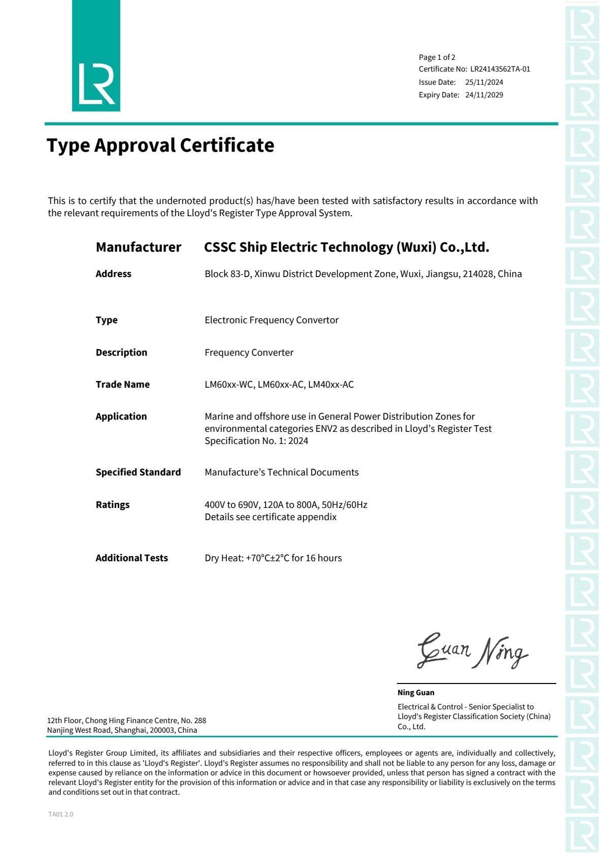 2024年11月25日,中船賽思億(無錫)電氣科技有限公司(CSSC Ship Electric Technology ( Wuxi) Co.,Ltd.)核心變頻電控設(shè)備順利取得英國勞氏船級社(LR)型式認可證書,成為國內(nèi)為數(shù)不多的取得英國勞氏船級社(LR)型式認可證書的船舶電力推進企業(yè)。目前中船賽思億已取得CCS、BV、RINA、DNV、LR等五大國際主流船級社型式認可證書,是目前國內(nèi)唯一一家擁有五大船級社型式認可證書的國產(chǎn)船舶電力推進企業(yè),對中船賽思億的海內(nèi)外市場開拓和國際化發(fā)展進程,具有重要意義。
