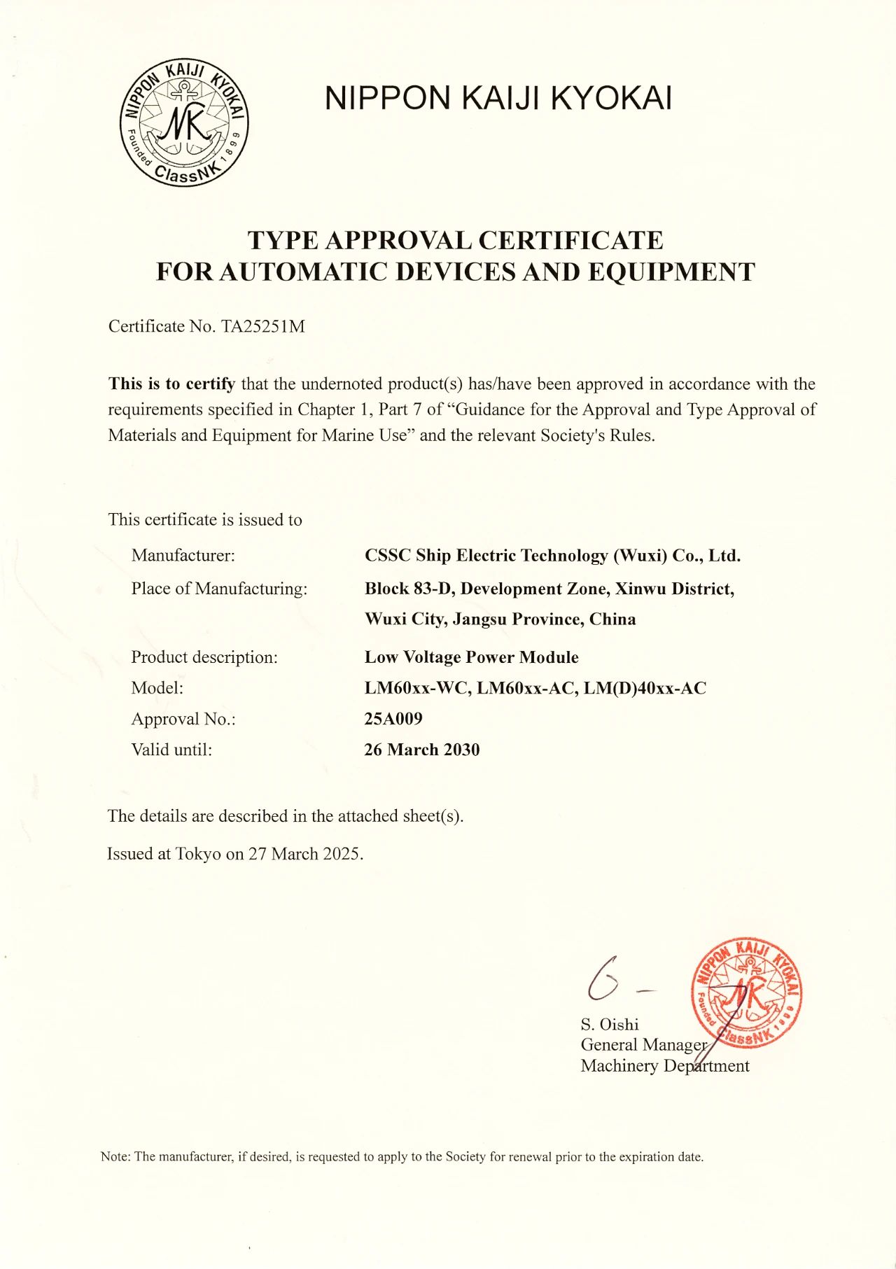 2025年3月27日,中船賽思億(無(wú)錫)電氣科技有限公司(CSSC Ship Electric Technology ( Wuxi) Co.,Ltd.)核心變頻電控設(shè)備順利取得日本船級(jí)社(NK)型式認(rèn)可證書,成為國(guó)內(nèi)為數(shù)不多的取得日本船級(jí)社(NK)型式認(rèn)可證書的船舶電力推進(jìn)企業(yè)。目前中船賽思億已取得CCS、BV、RINA、DNV、LR、ABS、NK等七大國(guó)際主流船級(jí)社型式認(rèn)可證書,是目前國(guó)內(nèi)唯一一家擁有七大船級(jí)社型式認(rèn)可證書的國(guó)產(chǎn)船舶電力推進(jìn)企業(yè),對(duì)中船賽思億的海內(nèi)外市場(chǎng)開(kāi)拓和國(guó)際化發(fā)展進(jìn)程,具有重要意義。