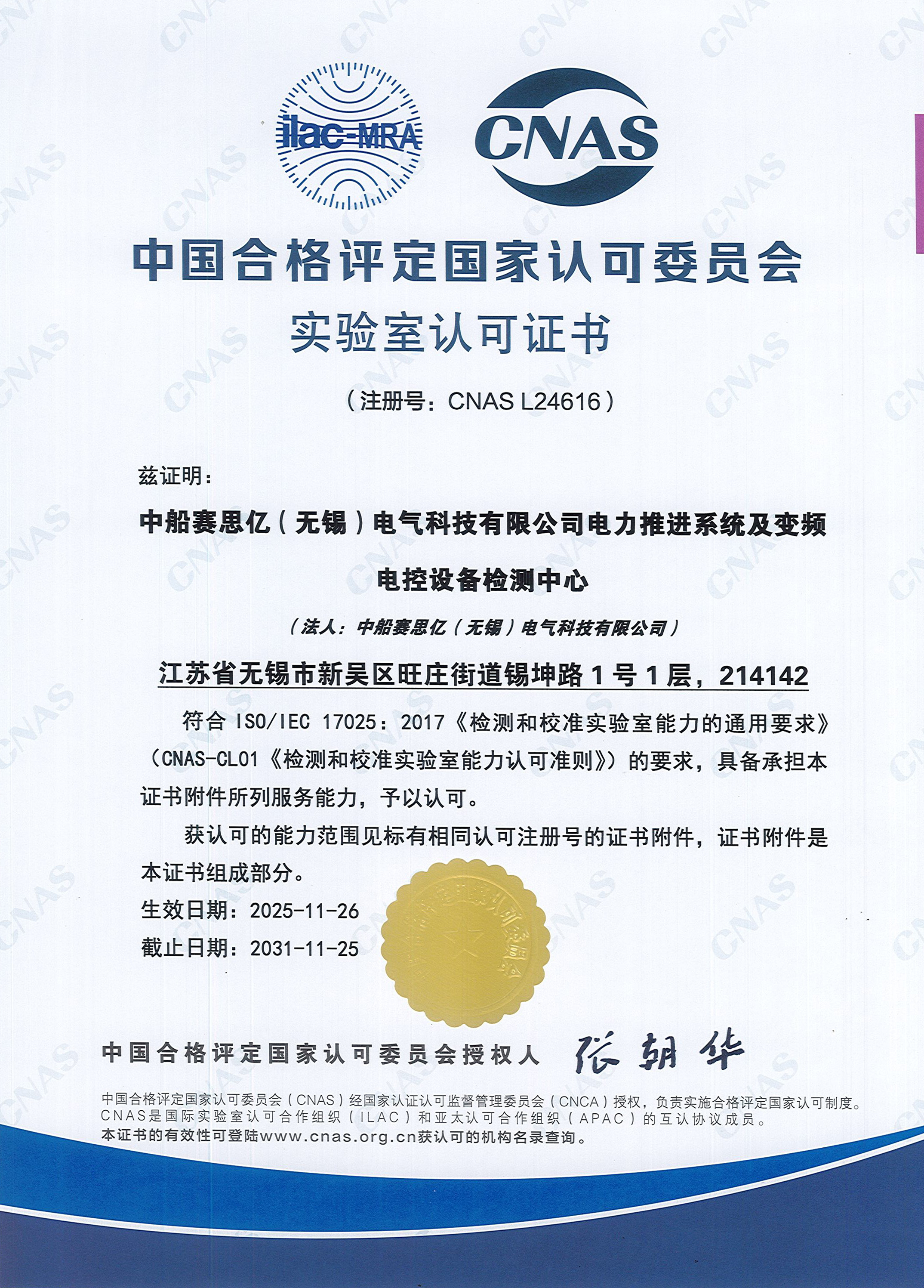 2025年11月26日,中船賽思億(無(wú)錫)電氣科技有限公司(CSSC Ship Electric Technology ( Wuxi) Co.,Ltd.)電力推進(jìn)系統(tǒng)及變頻電控設(shè)備檢測(cè)中心順利取得中國(guó)合格評(píng)定國(guó)家認(rèn)可委員會(huì)(CNAS)實(shí)驗(yàn)室認(rèn)可證書(shū)(注冊(cè)號(hào):CNAS L24616),此舉標(biāo)志著中船賽思億在電力推進(jìn)系統(tǒng)性能驗(yàn)證、變頻電控設(shè)備可靠性測(cè)試等核心環(huán)節(jié)的檢測(cè)能力,以及全流程質(zhì)量管理體系已達(dá)到了國(guó)家 / 國(guó)際認(rèn)可的水平,該檢測(cè)中心出具的檢測(cè)數(shù)據(jù)、報(bào)告在國(guó)內(nèi)及互認(rèn)的國(guó)際范圍內(nèi)具備高權(quán)威性和公信力。