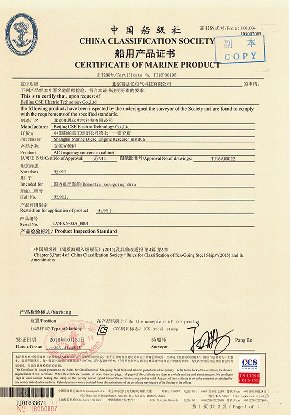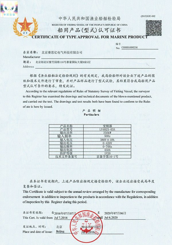 “浙漁科2”號(hào)柴電混合動(dòng)力系統(tǒng)變頻器船檢及漁檢證書