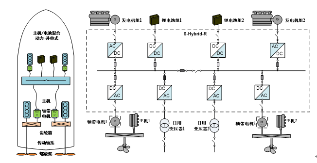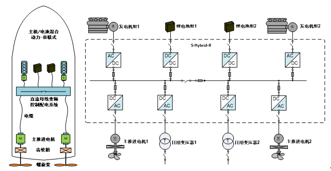 系統(tǒng)配置發(fā)電機組和超級電容作為游船動力,采用S-Hybrid-R串聯(lián)式解決方案,系統(tǒng)集成度高、接口簡便,明顯改善機艙設(shè)備占地空間及重量。