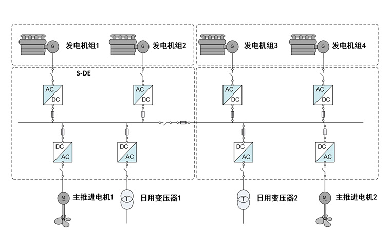 柴油機(jī)組為動力源,推進(jìn)電機(jī)驅(qū)動推進(jìn)器