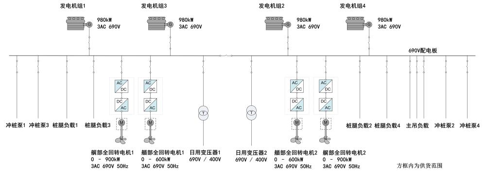 華電穩(wěn)強(qiáng)自升式海上風(fēng)電作業(yè)平臺(tái)電力推進(jìn)系統(tǒng),賽思億集成范圍包括AFE型推進(jìn)變頻器、推進(jìn)電機(jī)、推進(jìn)控制系統(tǒng)及舵槳,相比傳統(tǒng)二極管整流方案(DFE)電氣設(shè)備占地面積節(jié)省約15.8m2,節(jié)省重量約12噸,整套系統(tǒng)更加契合風(fēng)電安裝平臺(tái)的要求。